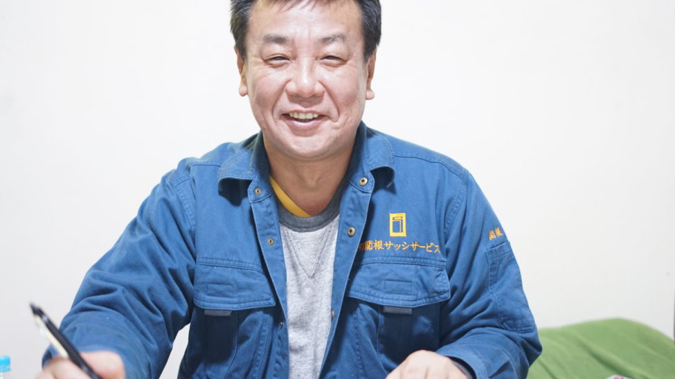 ―もともとサッシ取り付け職人だったことから もともと同じこの職種の施行をやってたんです。現場取り付け専門です。親方が居て、15、6歳から、そこにお世話になって、専属の取り付け職人ですね。そこに世話になっていて13年目に、…